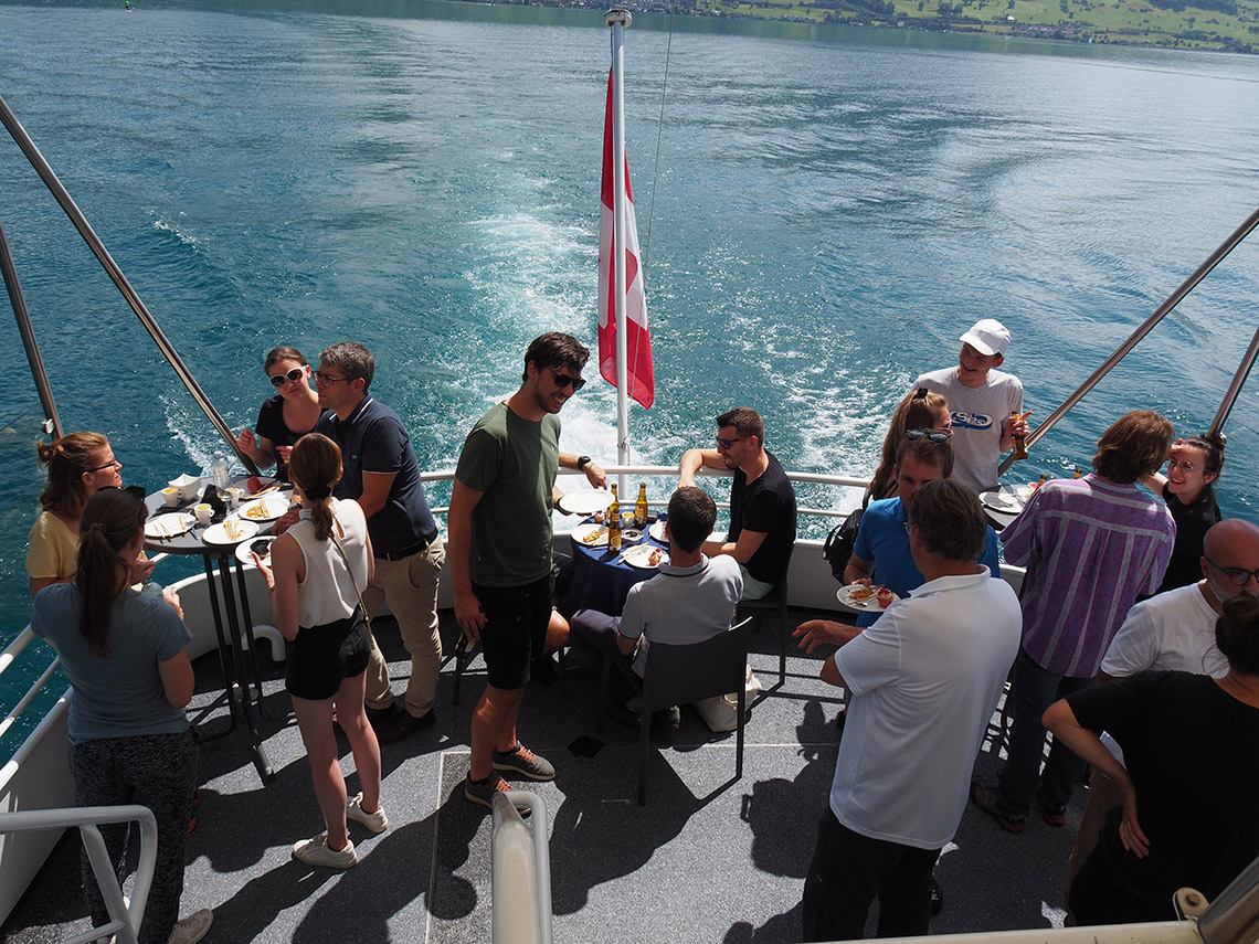 Anschliessend erwartete uns am Bootshafen Flüelen die MS Dragon. Mit dem Partyboot ins Abendrot … zumindest beinahe. Bei schönstem Sommerwetter, das das umgebende Wasser türkisblau erstrahlen liess, führte unser Kurs in weitem Bogen über den Vierwaldstättersee. Das Schiff legte ab, DJane Monica Babilon legte auf, unsere imposante Geburtstagstorte versüsste uns die Fahrt, und unsere Feierlaune wuchs von Seemeile zu Seemeile …