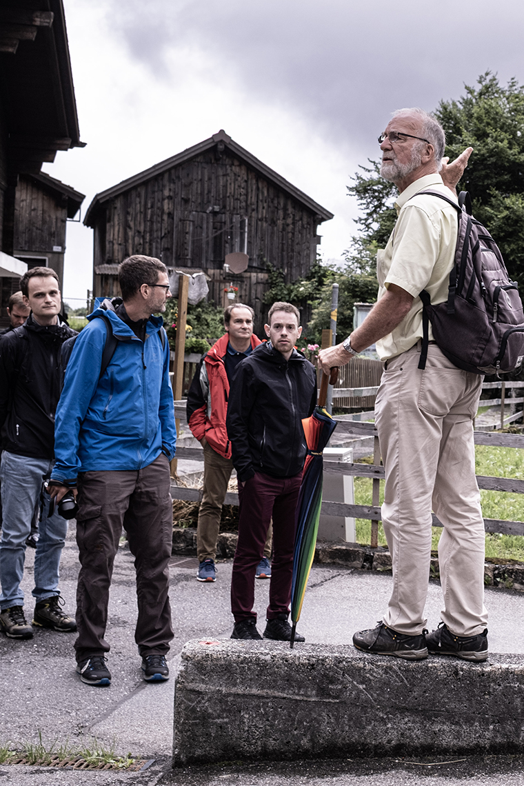 Anschliessend erwarteten uns im Hotel Bären Guttannen ein grosszügiges Zmittag und mit dem Geomorphologen Markus Zimmermann und Damian Stoffel, Leiter Bereich Hochwasserschutz am Tiefbauamt des Kantons Bern, zwei Fachleute, die uns am Beispiel der Murgangereignisse im Spreitgraben die lokalen Auswirkungen des Klimawandels veranschaulichten. Ihre kenntnisreichen Erläuterungen begleiteten unsere kleine Wanderung talabwärts, vorüber an den mächtigen Geröllhalden, die die Landschaft so tiefgreifend veränderten. Ein heftiger Platzregen ereilte uns auf der Wanderschaft und liess uns für einen Moment passend zum Thema erahnen, welche Kraft das Wasser im Bergland entwickeln kann.