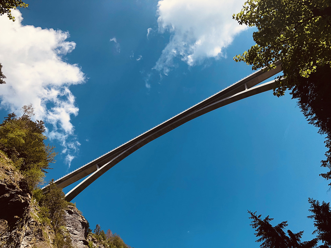 Begleitet von Sommerferienpostkartenwetter und mit der Freude über den am Vorabend gewonnenen Building-Award im Rucksack schnürten wir am Morgen des 7. Mai gut gelaunt die Stiefel. Unser dritter Bürowandertag führte uns in das Taminatal, wo uns neben wild-romantischen Naturerlebnissen auch das Studium von Bau- und Bäderkultur erwartete. Von Bad Ragaz aus starteten wir auf dem Badtobelweg in die schattige Schlucht, schon bald kündigte sich über unseren Köpfen unsere erste Ingenieursstation an – die 2017 fertiggestellte Taminabrücke (LAP). Dankenswerter teilten Vertreter des Ingenieurbüros Meichtry & Widmer mit uns ihr „Insiderwissen“ zum Bau der grössten Bogenbrücke der Schweiz. Sie waren im Auftrag der ausführenden Unternehmungen massgeblich in die Planung des Bauablaufs und der Bauhilfsmassnahmen involviert. Vor Ort und während des Mittagessens erläuterten sie uns Vorgeschichte, Entstehung und Tragwerksentwurf der 417 m langen Brücke und gaben uns detailreiche Einblicke in die Ausführung des Brückenbogens im seilverspannten Freivorbau.