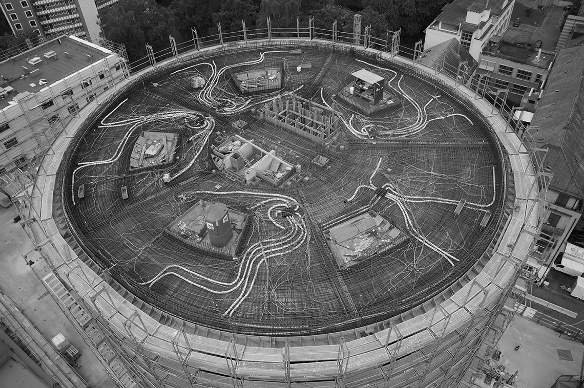 Les particularités du cadre structurel du projet sont le système porteur spécial de la tour ainsi que l’extension sud, les structures d’étayage et de soutien nécessaires et les divers ajustements et renforcements de la structure existante, combinés à des processus de construction complexes. Les extensions comprenaient principalement l’agrandissement du sous-sol, tant à l’intérieur qu’à l’extérieur du plan de masse du bâtiment en surface, l’ajout d’un autre étage au bâtiment d’atelier existant, la construction d’une tour de neuf étages résidentiels au-dessus des rampes d’accès existantes et le nouveau transfert de charge aux fondations via l’espace à l’intérieur des rampes.
