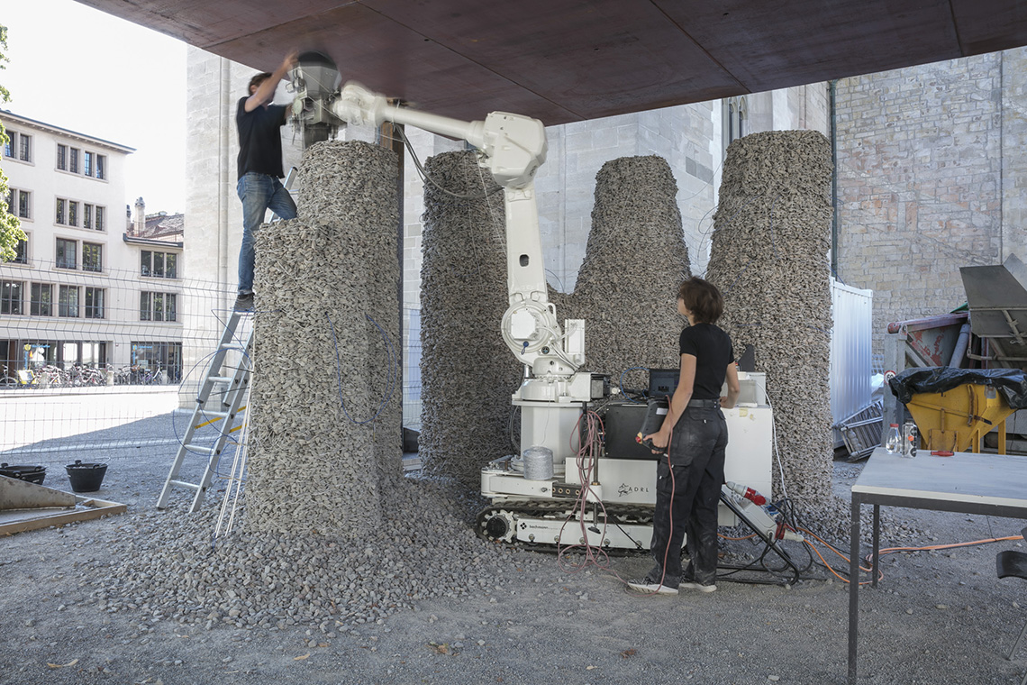 Der „Rock Print Pavilion“ war ein Forschungsobjekt, temporäres Bauwerk und Exponat der „Hello, Robot“-Ausstellung des Gewerbemuseums Winterthur. Aus losem Schotter und Schnur durch einen mobilen Roboter gebaut, demonstrierte er beispielhaft die transformierende Kraft digitaler Bauprozesse.