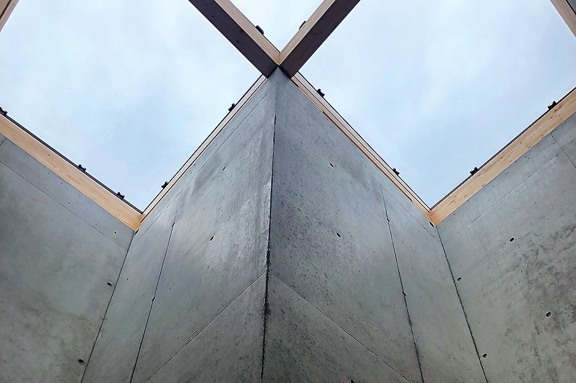 Die Planung erfolgte mit einem hohen Anspruch an einen effizienten BIM-Prozess, an dem alle Projektbeteiligten engagiert mitwirkten. Für die oberirdischen Geschosse kam so weit wie möglich Holzbauweise zum Einsatz. Limitiert wurde dies insbesondere durch die hohe Schwingungssensibilität der Labornutzung, die eine Konstruktion in Massivbauweise erforderlich machte. Aufgrund dieser Anforderungen wurde die Kernzone mit den zentralen Messlaboren im Obergeschoss wie die Untergeschosse in Beton-Massivbauweise ausgeführt. Das Labor mit den höchsten Schwingungsanforderungen befindet sich in einer 13 x 13 x 4.4 m grossen Box aus Stahlbeton, angeordnet zwischen den Kernen im Obergeschoss. Diese ist über acht Schotten mit den vier Erschliessungskernen verbunden und «schwebt» über der freien, multifunktional genutzten Fläche im Erdgeschoss.
